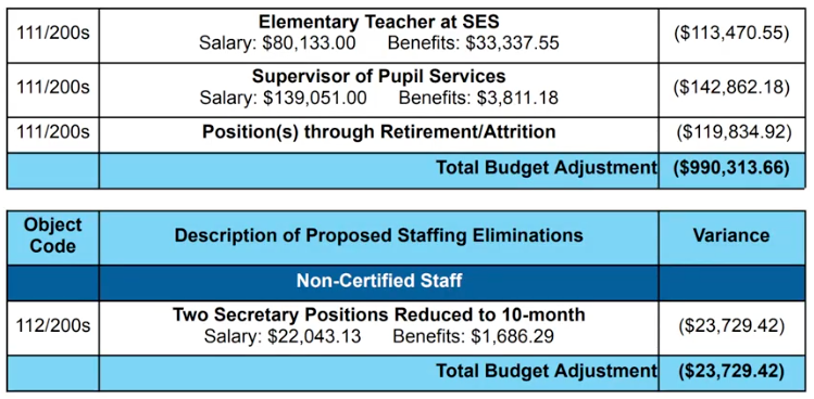 There will be significant reductions in staffing from interventionists to elementary school teachers. Dr. Norbut described creative staffing and scheduling to stretch the remaining budget dollars as much as possible. For instance, she stressed finding some way to continue providing some level of band instruction at the elementary level despite eliminating a full-time band teacher there.